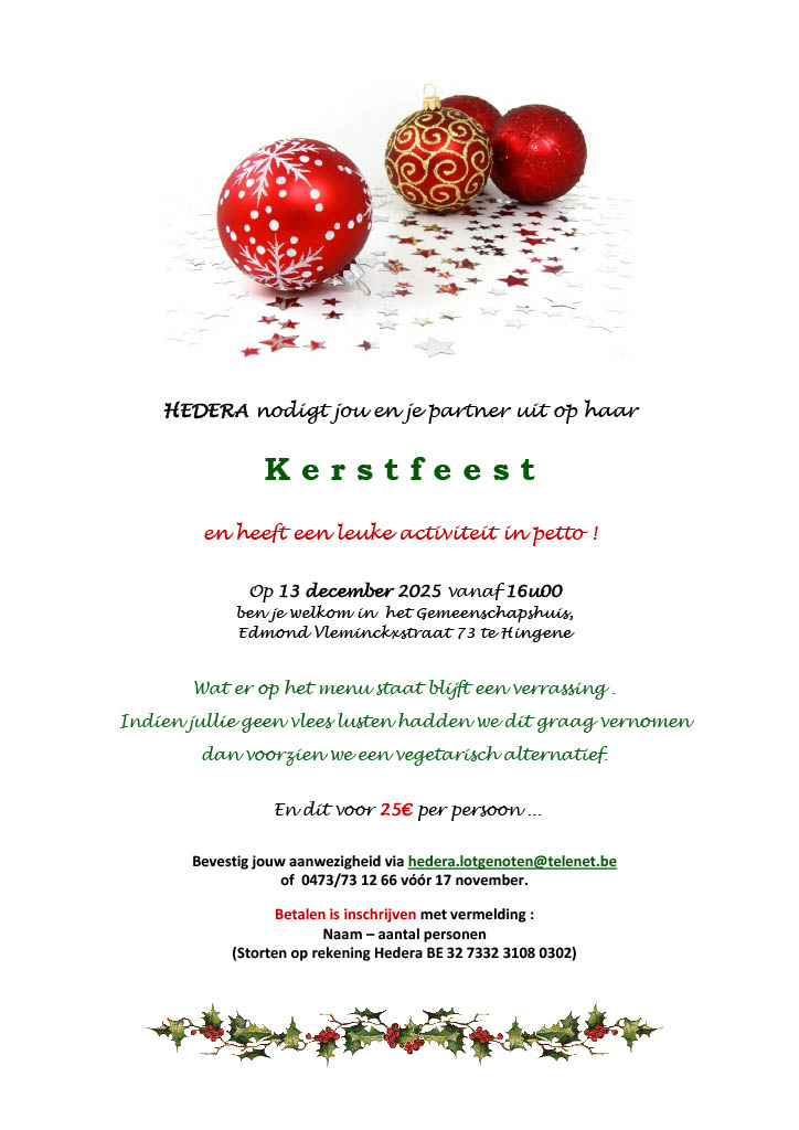 | 13/12/2025 | 16u00- | Kerstfeest ・Gemeenschapshuis Hingene |